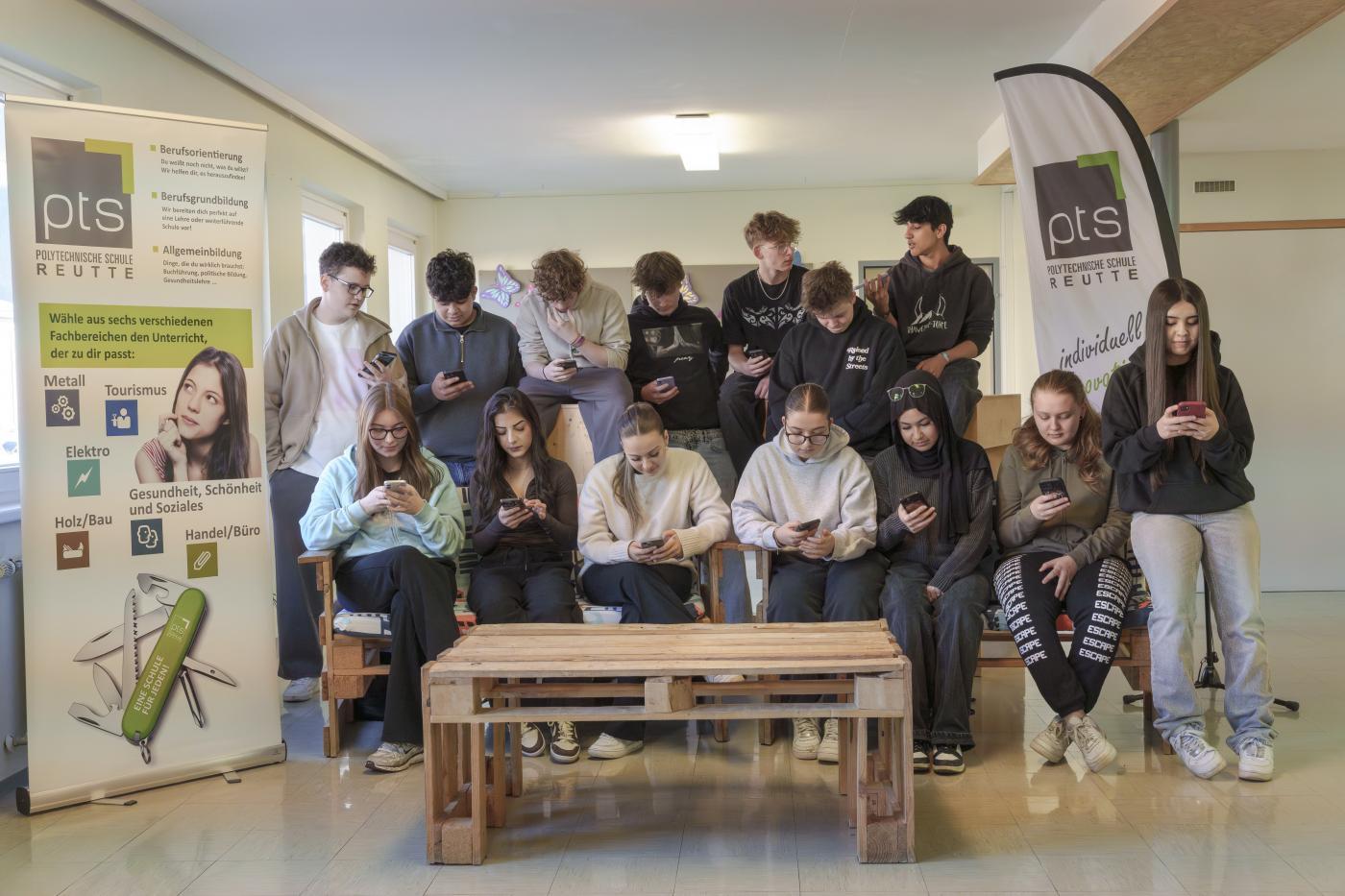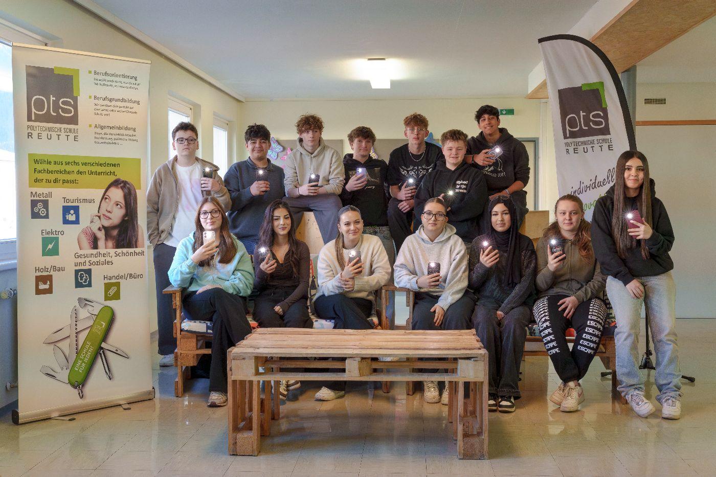 Am Mittwoch in der Früh trafen sich unsere Schülerinnen und Schüler vor dem Sporttag im Pausenraum und .... schalteten ... ihre ... Handys ... aus! Auch die Schifahrer:innen drückten den Knopf gemeinsam. (siehe Video von Carina Lechleitner)